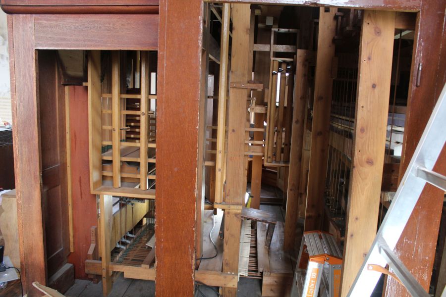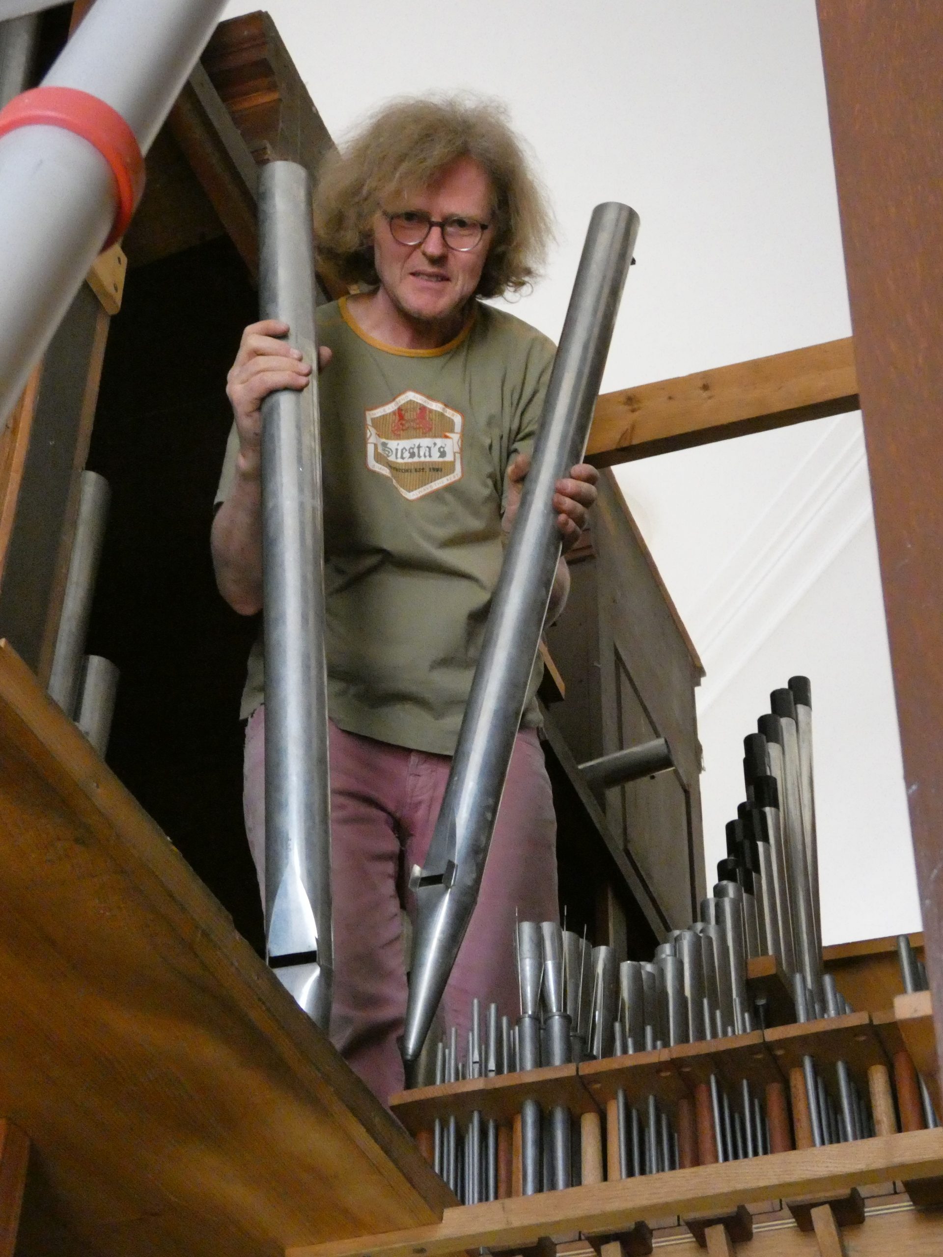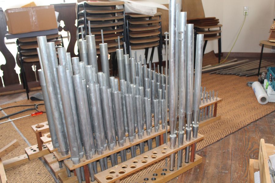 Die Pedalregister und die Pfeifen des Hauptwerkes der Orgeln sind noch in der Kirchew, die Orgel begleitet weiterhin – mit reduzierten Klangmöglichkeiten – die Gottesdienste.
