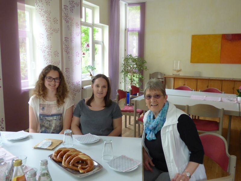 Ganz freundlich wurden wir bewirtet und von Frau Rosemarie Steurenthaler empfangen. Sehr engagiert erzählte sie uns über die Arbeit des Fördervereins, der 1980 gegründet wurde und 1995 das erste Elternhaus gebaut hat. Dort können Eltern, die ein krebskrankes Kind haben, während der Behandlung des Kindes wohnen. Ein weiterer Schwerpunkt der Arbeit besteht in der Unterstützung der Familien mit einem kranken Kind und der Betreuung von Geschwisterkindern in der Kindertagesstätte „Regenbogen“. Schon 2005 bestand die Notwendigkeit, das Elternhaus zu erweitern. Das Freiburger Elternhaus ist oft für die betroffenen Eltern ein zweites Zuhause! Mit den Spenden wird nicht nur das Elternhaus finanziert, sondern viele Gelder fließen in medizinische Geräte. So konnte 2007 ein MRT-Gerät (Magnet-Resonanz-Tomograph) für 1,5 Millionen Euro angeschafft werden. Lena und Ronja waren jedenfalls total beeindruckt. Aber auch Frau Steurenthalter war beeindruckt von der Spende, schließlich waren es 1.605 Euro, die übergeben werden konnten.