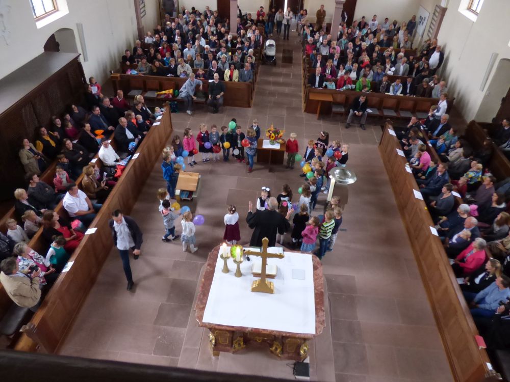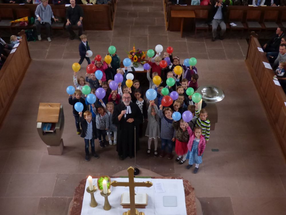 „Bunt ist Gottes Welt!“, so war das Thema, zu dem Pfarrer Adler sprach. Es ist gut, dass wir verschieden sind und so voneinander und miteinander lernen können. Einen Eindruck für das Buntsein bekamen alle, als die Schulkinder mit bunten Luftballons sich vor dem Altar versammelten.