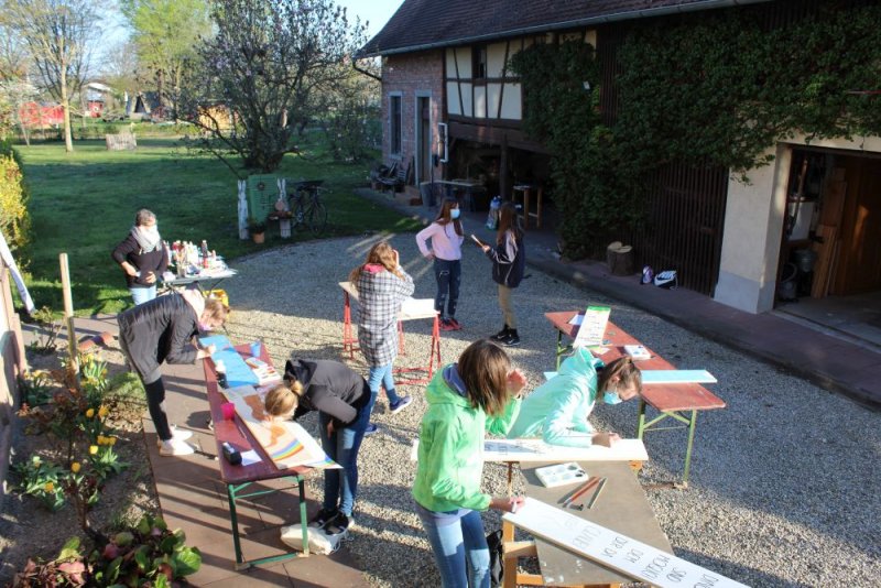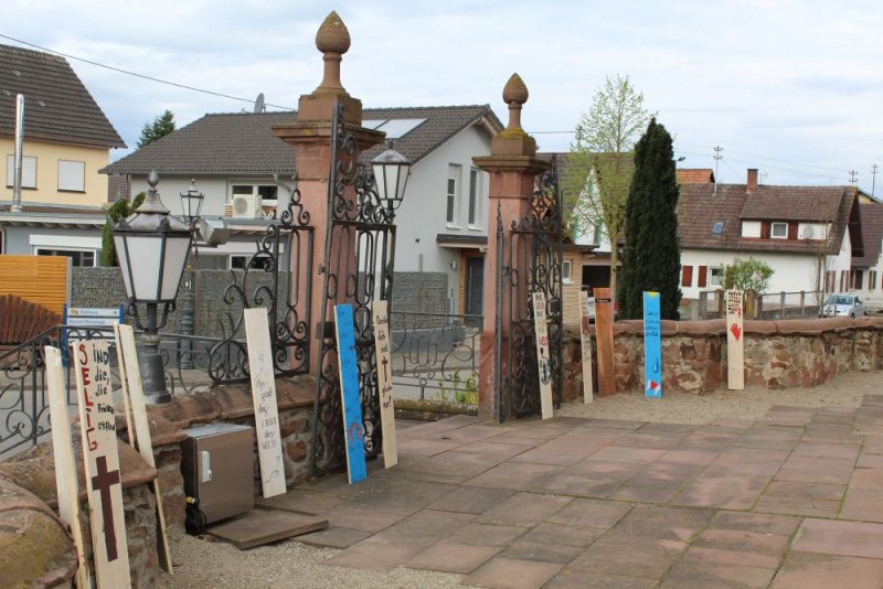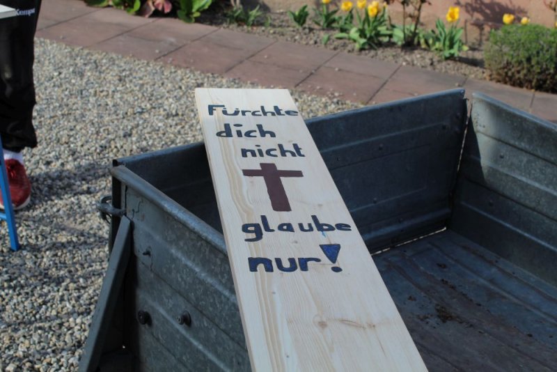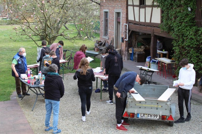 Die handwerkliche Umsetzung fand dann im Pfarrgarten statt, so dass wir genügend Abstand zueinander einhalten konnten. Diese Mut-Mach-Sprüchen wollten die Konfirmandinnen und Konfirmanden auch den Gottesdienstteilnehmenden zusprechen, deshalb waren sie vor den Kirchen aufgestellt.