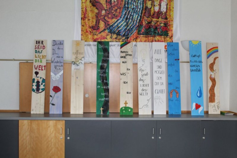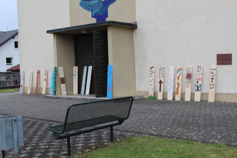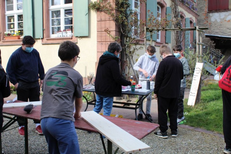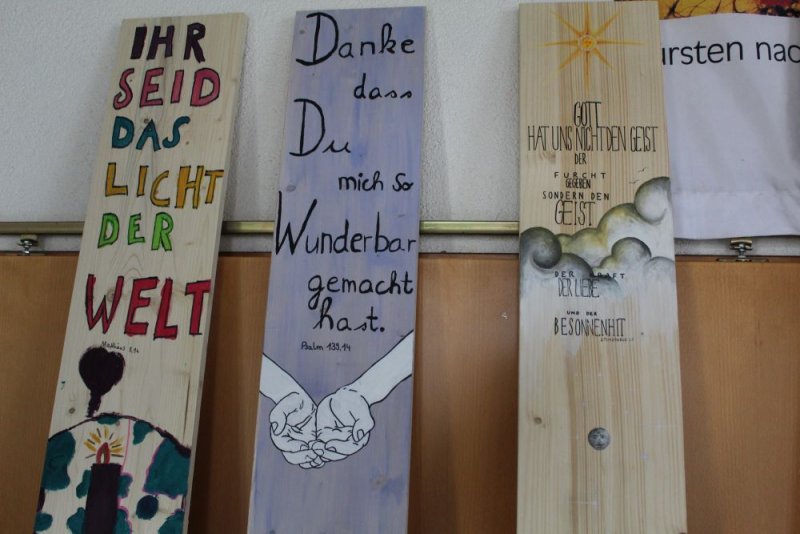 In den Osterferien trafen sich die Konfirmandinnen und Konfirmanden – auf Abstand. Zuerst wählten die Konfirmanden sich einen biblischen Mut-Mach-Spruch und überlegten sich für diesen Spruch eine Gestaltungsform. Das Medium waren Holzbretter, auf diesen sollte der Spruch geschrieben und gemalt werden.
