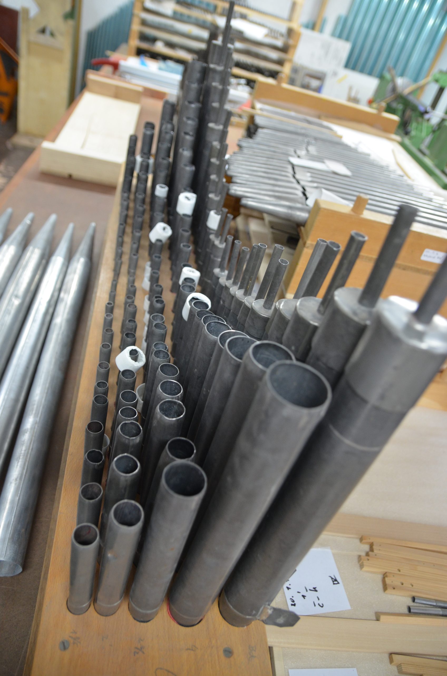 Mitte September 2022 begann Orgelbauer Andreas Schiegnitz mit dem Ausbau von Pfeifen und Windladen. Ein Manual ist nun – mit seinen dazugehörenden Pfeifen – ausgebaut und wird in der Orgelbauwerkstatt restauriert. Dazu gehört eine akribische Dokumentation des Pfeifenmaterials und die anschließende restauratorische Bearbeitung.