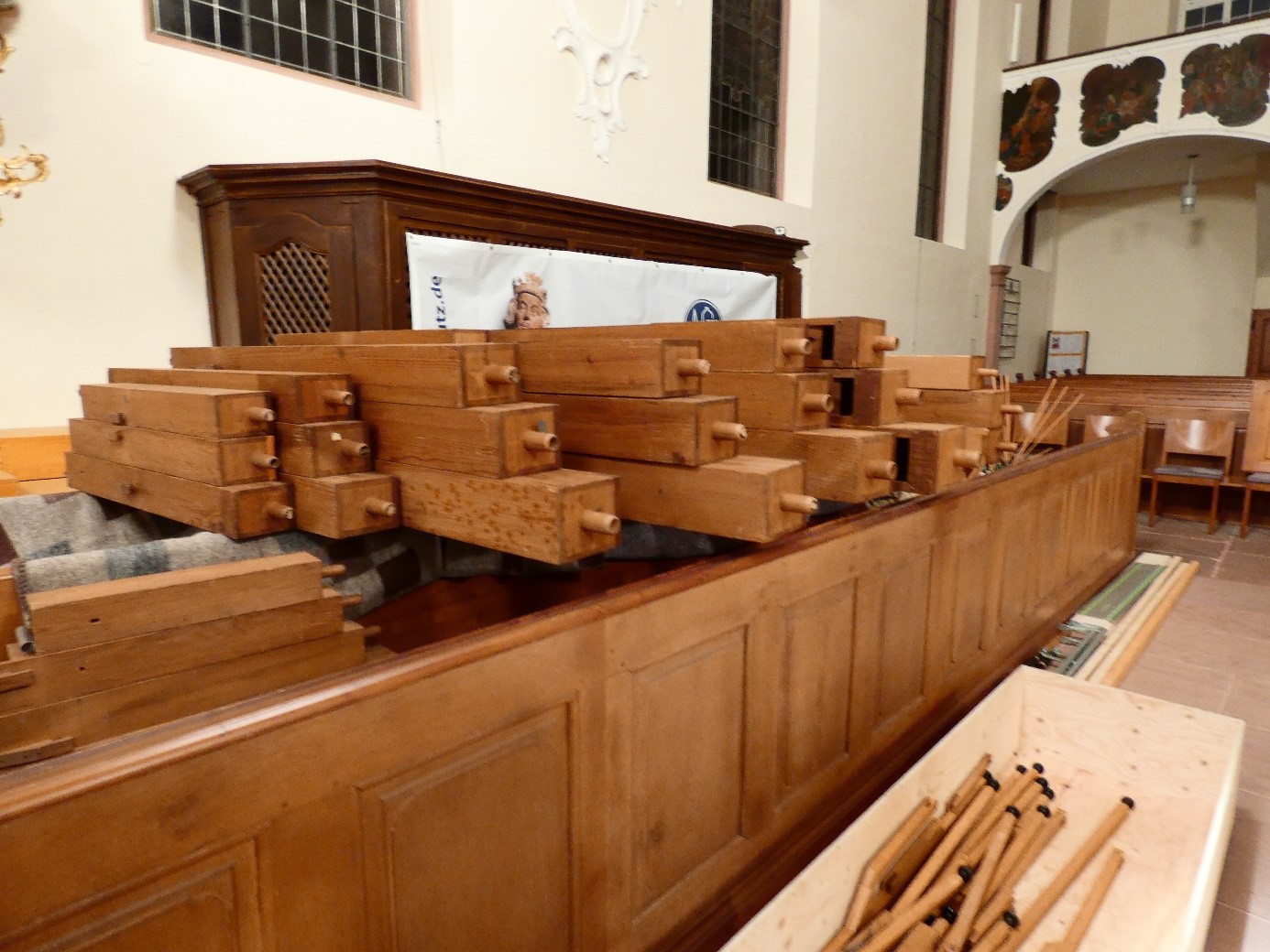 Die Pedalregister und die Pfeifen des Hauptwerkes der Orgeln sind noch in der Kirchew, die Orgel begleitet weiterhin – mit reduzierten Klangmöglichkeiten – die Gottesdienste.