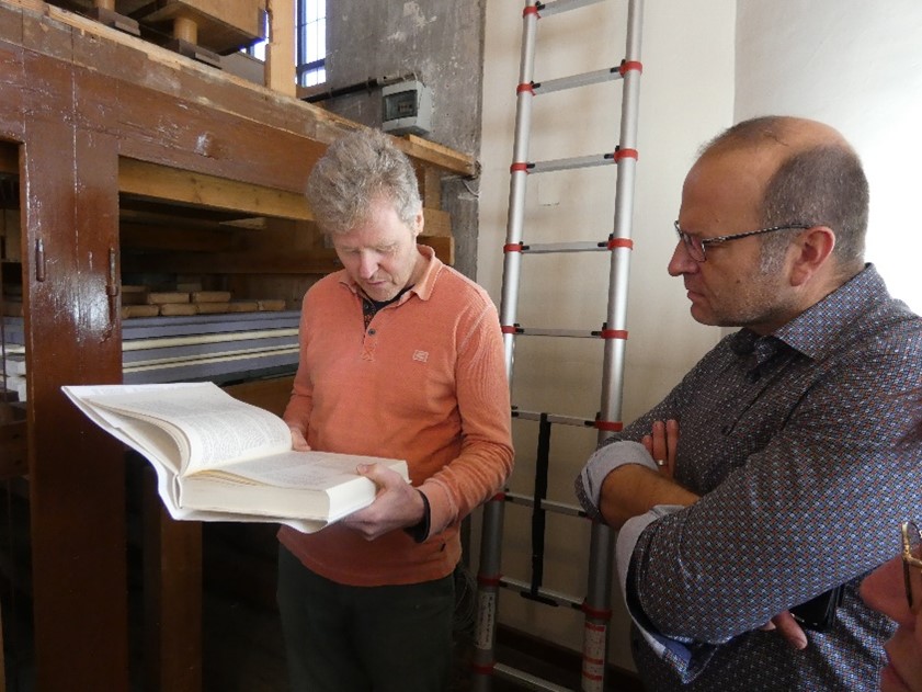 Vor dem behutsamen Abbau der Pfeifen, Mechanikteile und Windladen standen noch einige Tage an genauer Forschungsarbeit an. Jedes Brett, jeder Nagel und natürlich auch jede Pfeife wurde dabei untersucht. Zusammen mit Klangspezialist Ulrich Becker aus Konstanz hat Andreas Schiegnitz zahlreiche Messungen an Pfeifen und Gehäuseproportionen durchgeführt und dabei erstaunliche Zusammenhänge zu Tage gefördert.