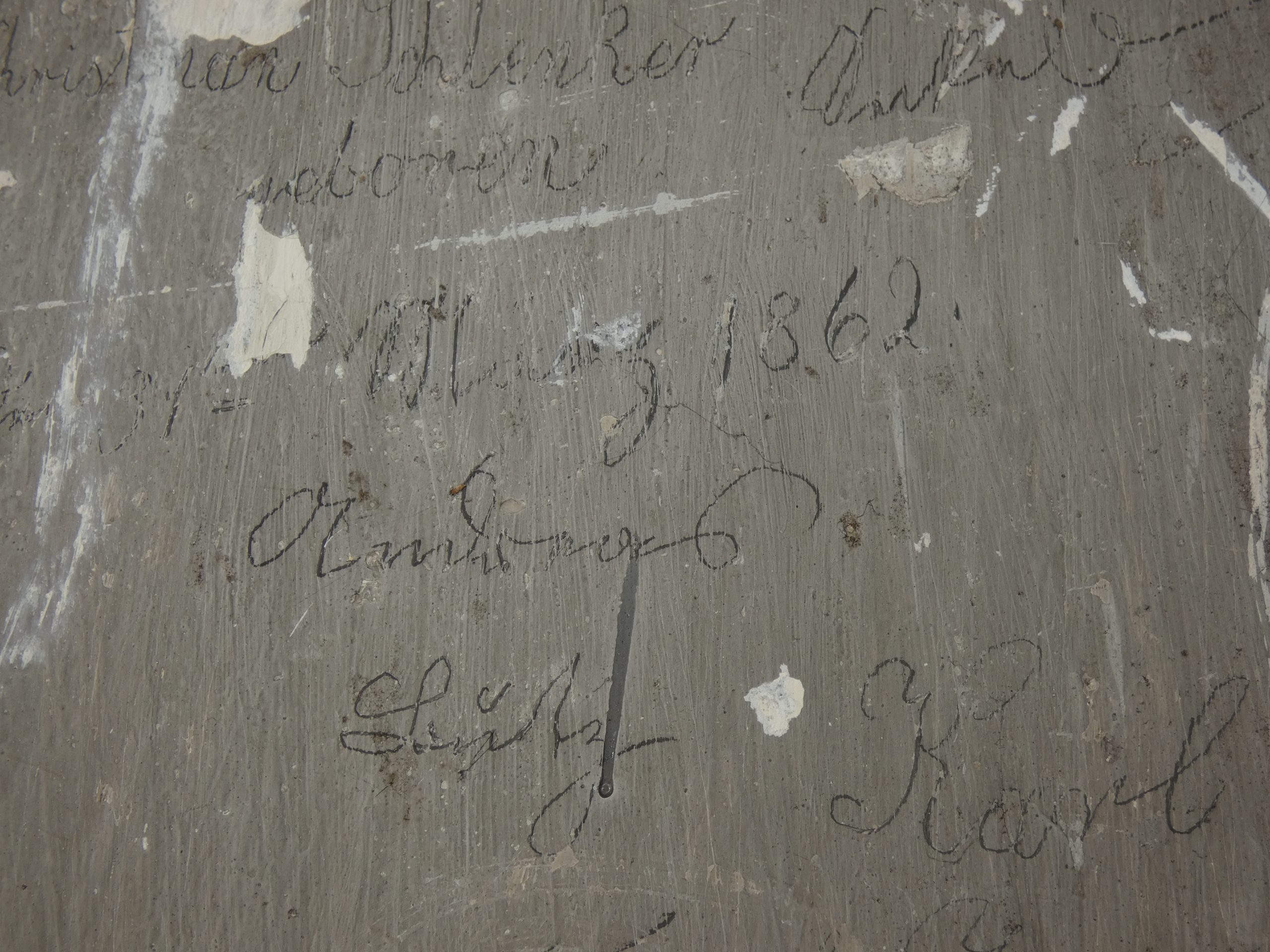 Die eigentliche vorgesehene zügige Ausführung von kleineren Handwerkerarbeiten im Bereich hinter der Orgel an Wand und Fenster gerieten so erstmal ins Stocken, denn die unerwarteten Funde mussten seitens des Denkmalschutzes begutachtet werden. Weitere Besprechungen und Beratungen folgten und inzwischen ist klar, dass auch diese Inschriften behutsam gereinigt, dokumentiert und gesichert werden. Ob das die Balgtreter von 1862 geahnt haben, dass ihre Kritzeleien 160 Jahre später einmal in eine Dokumentation eingehen?