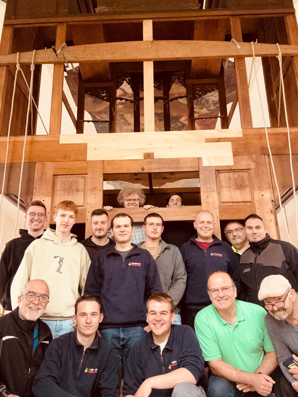 Orgelbaumeister Andreas Schiegnitz und seine Mitarbeiter wurden dabei tatkräftig unterstützt von fünf Mitgliedern der Meißenheimer Feuerwehr, sowie von Kirchengemeinderat Heinz Reith, Pfarrer i.R. Heinz Adler und Bürgermeister Alexander Schröder.